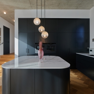 Schodnice vyrobené z akátových fošen (akát je vodné dřevo do exteriéru). Schody byly zhotovené v našem truhlářství včetně ocelových podschodnic a minimalistického zábradlí.